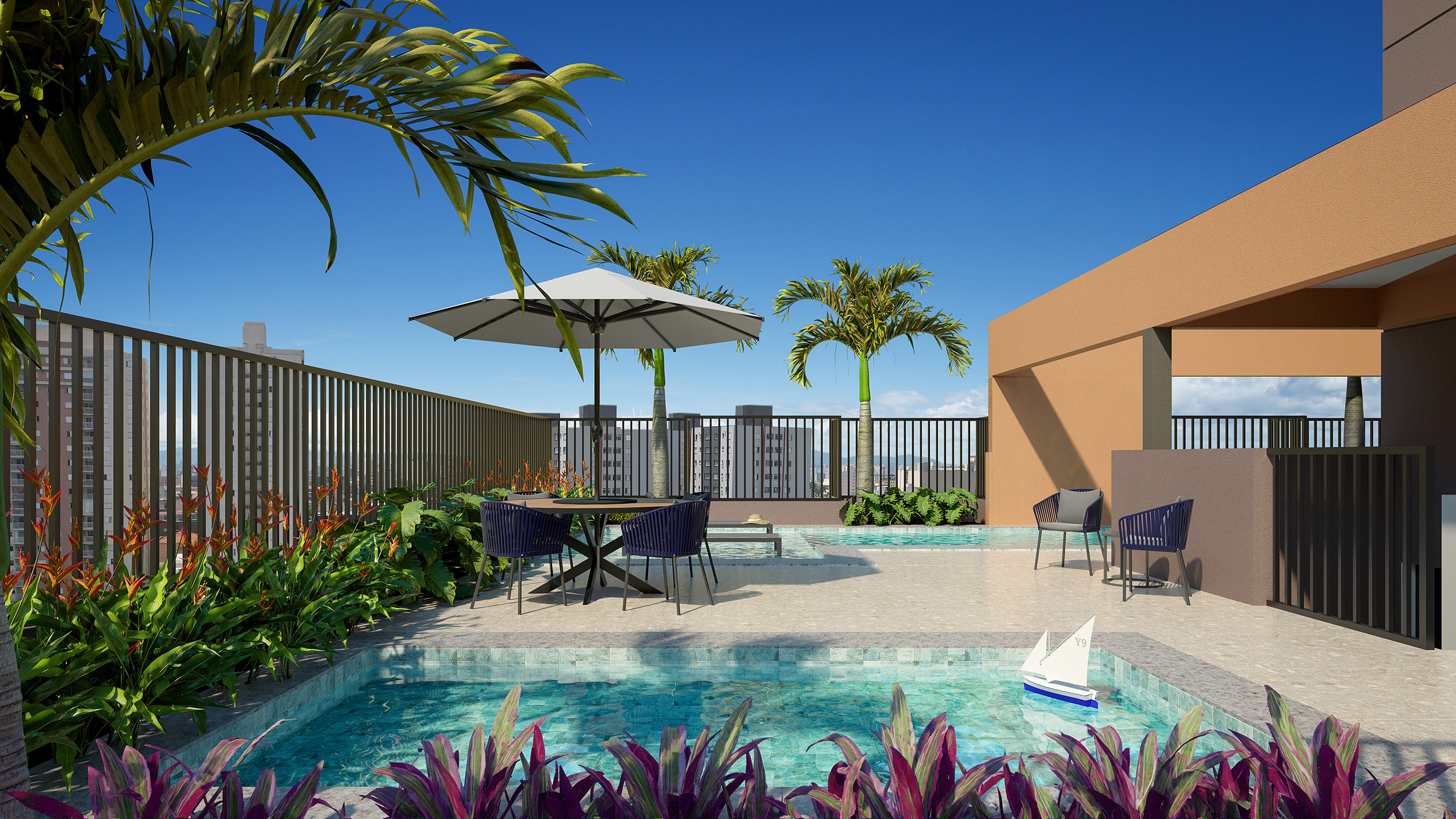 Residencial: mini mercado, delivery, praça de trabalho, bicicletário, pet place, lavanderia, praça de convivência, praça fogueira, salão gourmet, salão de jogos com lounge bar, espaço bem estar, sala de lutas/funcional, academia, espaço criança piscina infantil, piscina adulto com deck molhado, solarium, sauna seca com sala de descanso, sala de massagem, salão de festas com praça de apoio, playground, churrasqueira externa.